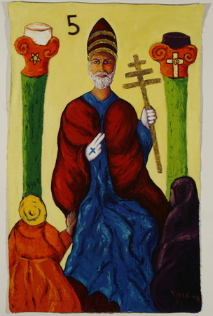 È la volontà buona verso il miglioramento spirituale. È l’archetipo del potere più forte di quello paterno, spirituale, infallibile, il guru, il maestro. Il papa è sovrumano oltre le persone inginocchiate che benedice. Egli è il pontefice, il ponte di unione. E in questo rappresenta anche la psiche che ci porta all’anima. 1 suoi guanti bianchi indicano che le sue mani, pure, non si contaminano mai. 1 guanti portano una croce azzurra ciascuno colore dell’anima e della fedeltà. L’azione del papa si svolge su tre piani: quella della sua tiara (diadema) e della sua croce a tre livelli e il tre delle dita. La croce è triplice per ricordare la trinità che è cattolica ma anche indù (e la legge del tre). E tre gli stadi della corona in capo. Il papa è di fronte a due figure: triplice manifestazione delle cose nascoste (padre, figlio e spirito santo, come nella triade indù), come la croce tripla della sua tiara e il segno del tre con le dita. La croce triplice è la croce di S. Giorgio, croce dei Templari. Domina su tre livelli: fisico, intellettuale e spirituale. le due colonne sono la colpa e il merito, ognuno di noi dondola sull’altalena fra questi due pilastri. |